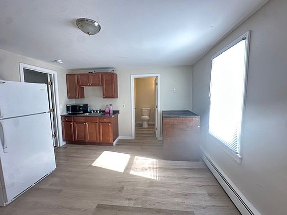 Eat-in kitchenBaseboard heatingWarm wood cabinetryNeutral wallsWood-look floors