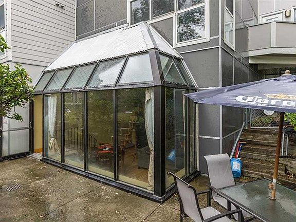 Corner unitWall of atrium windowsPrivate patioNatural lightOpen concept livingBuilt-in murphy bedShelving and desk