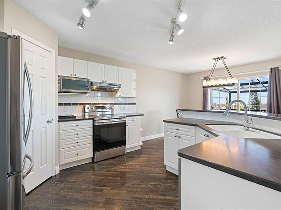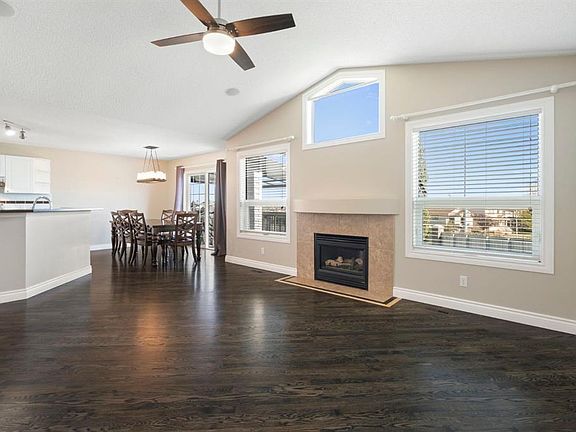 Incredible custom-built home on a pie-shaped lot in desirable Panorama Hills! The main floor features stunning site-finished, ebony-stained red oak hardwood floors and soaring vaulted ceilings with built-in speakers, creating a warm and inviting living space centred around a gas fireplace and triple-pane windows. The kitchen impresses with Corian countertops, an under mount sink, and recently upgraded stainless steel appliances, flowing seamlessly into the dining and living areas that overlook the spacious nook and massive backyard. The main floor also features an updated 4-piece bath, a large bedroom, a flexible second bedroom or office, and an additional flex space/living room off the kitchen. Upstairs, the primary suite is a true retreat with a walk-in closet with custom shelving and a renovated ensuite boasting a corner jetted tub, separate shower, and Corian counters. The walkout basement is an entertainer’s dream, featuring 12-foot ceilings ideal for a pool table or large recreational area, a dry bar, a full 3-piece bathroom, and direct access to a paving stone patio. Step outside to a massive backyard with mature landscaping, underground sprinklers, perennials, two sheds, and a composite deck with glass railing and natural gas BBQ hookup. A thoughtfully designed concrete staircase on the side of the home leads to the basement entrance through sliding patio doors. With a brand new roof and eves troughs (2025), triple-pane windows, AC, fresh paint, updated lighting, a professionally cleaned home and carpets, and a garage with sturdy plywood walls, this home is truly move-in ready. Don’t miss your chance to live in this thoughtfully upgraded, elegant, and spacious home in Panorama Hills—perfect for entertaining, relaxing, and enjoying every comfort.