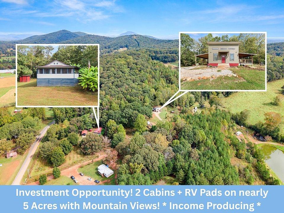 Incredible Investment Opportunity! 2 Cabins + RV Pads on nearly 5 Acres with Mountain Views! Calling all investors, entrepreneurs, or anyone seeking additional income! This rare and versatile property in Cleveland offers almost 5 acres of scenic, private land featuring two income producing cabins and multiple RV pads, all with power and water hookups in place. The first charming cabin, built in 2016, includes 1 bedroom, 1 full bathroom, and a cozy, efficient layout perfect for short-term or long-term rental. The second cabin, built in 2023, features an open floor plan with 1 bedroom, 1 full bathroom, and a loft, offering additional space and flexibility for guests or tenants. Multiple certified wells, and septic tanks and NO HOA!! Whether you're looking to build your real estate investment portfolio, create a vacation rental retreat, or live in one cabin rent the rest or build your dream home, this property offers endless potential. Conveniently located near downtown Cleveland, Hwy 365, Gainesville, and Yonah Mountain. Don't miss this one of a kind opportunity to own a turn-key investment in the heart of North Georgia!