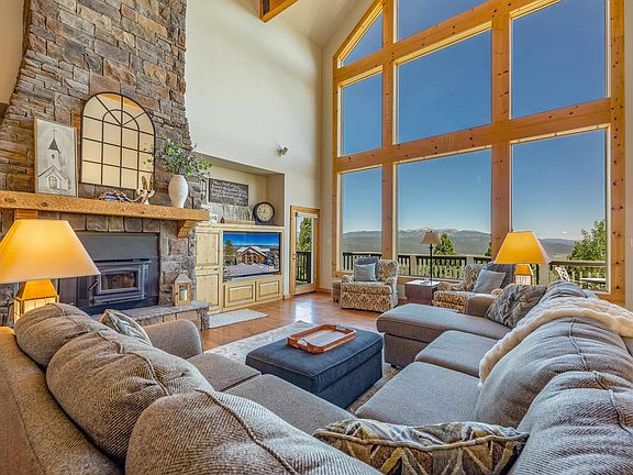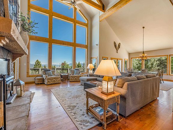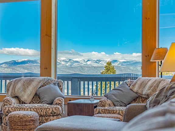 59 S Vail Overlook is located on one of the premier lots offering views and accessibility that is second to none. Designed to maximize the views in every direction each room offers an abundance of windows allowing you to enjoy all the beauty of Angel Fire from the comfort of your home. From the stunning entrance to the massive window wall, large beams, two story stacked stone fireplace (with wood stove insert for efficiency), and sophisticated natural finishes this home was built to amaze and to deliver comfort. The exterior siding is reclaimed wood from Wyoming offering a rustic contemporary finished with minimal maintenance. The pine floors are inch thick from reclaimed lumber burned in a forest fire, and the beams are specially milled hand finished Douglas Fir. The layout is perfect for two, yet big enough for a large family. The main floor includes the great room, dining room, kitchen, pantry, laundry room, powder room, and primary suite. The kitchen is an entertainer's delight with knotty alder cabinets, granite countertops, high-end appliances including a Wolf cooktop, bar seating, wet bar, desk, and walk-in pantry. The primary bedroom features a massive ensuite bathroom, complete with dual sink vanity, walk-in shower, and walk-in closet. Upstairs hosts a sitting area, three guest rooms, two bathrooms. The lower level features a game room, two guest rooms, full bathroom, two-car garage, ski room, mechanical room, and plenty of storage. Two large decks with low-maintenance Trex decking and a hot tub offer the perfect viewing point to catch our iconic sunsets. Fully furnished, decorated, and equipped with everything in the home exactly as you see it.