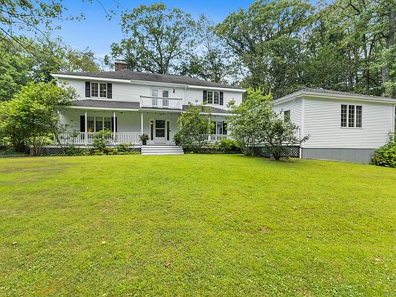 Opportunity Awaits! Bring your vision to this COLONIAL in desirable New Canaan. Potential for customization is limitless. Gorgeous 2 park-like acres with pond access and aerator welcomes you. Property features a peaceful yard, mature shade trees that line the driveway and lend privacy. Picturesque walking/biking community where neighbors gather. Wrap around porch invites you to sit, read, chat leisurely. Large foyer leads you to ample living spaces including; kitchen with island, dining room, living room and family room w/ wood burning brick fireplace. Three season porch. French doors to stone patio for dining al fresco. First floor guestroom w/ en-suite. Upstairs; 4 additional bedrooms, balcony, 2 hall baths and a Primary en-suite. Baths are finished with neutral colored tiles. Four garage bays total; 2 car attached garage and additional detached 2 car garage with bonus finished space above- perfect for home office, studio, gym, multi-generational living. Storage space abounds. Central Air to keep you cool. With its adaptable layout and prime location, this home presents a rare opportunity of convenience and possibility. Close to award winning New Canaan Schools, main commuting roads, Metro-North train, the Silvermine Art Guild and only a few minutes to shopping too! This home has a great floor plan to enjoy entertaining and everyday living. Portable generator to keep you running if ever needed. Untapped potential. Perfect to renovate into your dream home. Floor Plans are approximate.