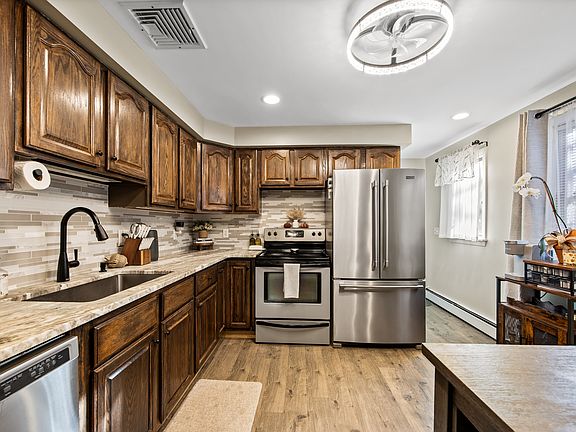 Welcome home to this beautifully updated 3-bedroom, 1-bath ranch offering 984 sq. ft. of comfortable living space. Perfectly situated as the last house on a quiet dead-end street, this property provides privacy and peace while still being close to local amenities. Step inside to find a remodeled kitchen featuring modern finishes and plenty of cabinet space-ideal for home cooking and entertaining. The inviting living room boasts a whitewashed fireplace, creating a cozy focal point for family gatherings. Enjoy year-round comfort with central air conditioning, oil forced-air heat, and electric baseboard heat in the basement for added flexibility. The newly renovated bathroom and new roof (2024) ensure this home is truly move-in ready. Outside, you'll find solar panels leased from sunrun to help reduce energy costs, a deep one-car garage, and a wide driveway offering plenty of parking. With its thoughtful updates, quiet location, and energy-efficient features, this home is the perfect blend of comfort, style, and convenience. Bill is $250 a month for solar and $100 a month to Eversource.