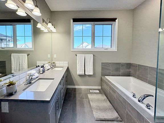 - Upstairs you are welcomed by a large bonus room which is separated from the rest of the upstairs. On this level you will find 3 bedrooms, one of which is the enormous master bedroom with a beautiful 5-piece ensuite with his and her sinks and a large tiled/glass door walk-in shower. Just down the hall is another 5-piece bathroom, again with his and her sinks. This makes a perfect bathroom for guests and other members of the family to share, leaving enough room for everyone!