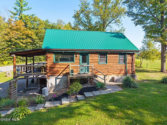 Modern comfort with Rustic Charm. Welcome to this beautifully maintained log home, offering warmth, character, and thoughtful updates throughout making it an ideal short term rental or full time and just feel like you are on vacation everyday! The kitchen boasts granite counters and a tumbled marble backsplash, while the updated bath, live edge woodwork, and wood floors add timeless appeal. Featuring a spacious loft bedroom, first-floor bedroom, and a full walkout basement with pellet stove, this home is ideal for year-round living or as a peaceful getaway. Upgrades include 2-zone oil heat, newer water heater, water softener, and a 3-year-old metal roof. The heated walkout basement provides endless possibilities—family recreation, workshop, or home office. Outdoors, enjoy the cozy front porch, new landscaping with circular driveway, detached shed, and fire pit for evenings under the stars. Snowmobile trails nearby! Just 1 hour to Albany & Cooperstown and 2.5 hours to NYC. A move-in ready retreat where modern comfort meets rustic living.