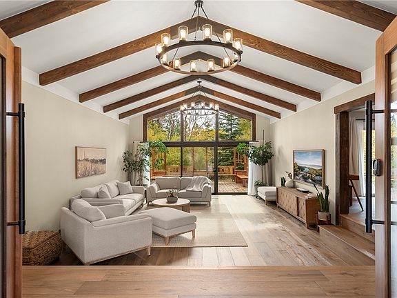 Spacious lotSingle-level homeExpansive windowsWhite oak flooringExpansive back deckVaulted beamed ceilingsHigh-end finishes