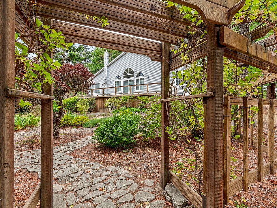 Custom-built and meticulously maintained this charming home offers a serene, park-like yard setting with mature landscaping. Inside you will find 2 bedrooms, 2 bathrooms, a large kitchen and bright great room with abundant natural light and a gas stove for cozy nights. A front sitting room with a gas fireplace for added warmth and charm. Tons of storage! Outdoor living on the spacious deck, perfect for entertaining. The property features an RV garage with a dedicated workshop space in back. Inside, the primary bedroom boasts a cozy library loft with ocean peaks, adding character and function. Nestled in a slightly protected area, the home enjoys some shelter from coastal winds. A rare blend of comfort, functionality, and natural beauty