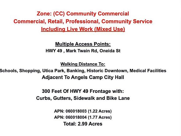 Bring Your Vision to Life in Angels Camp! Looking to build in a community that welcomes your development with open arms? This is your chance! Zoned Community Commercial (CC), these parcels offer endless opportunities for Commercial, Retail, Professional, and Community Services, including sought-after Live-Work (Mixed Use) designs. Located in the heart of the new Angels Camp Commercial District, just steps from the charm of Historic Downtown and the bustling Utica Park, these 2.99 acres deliver unparalleled visibility with nearly 300 feet of Highway 49 frontage. Positioned right in the center of Angels Camp, your project will stand out as a landmark development. These two legal parcels offer exceptional access from three roads, making them ideal for a variety of uses. Sharing the block with City Hall, successful professional offices, and US Bank, your development will be surrounded by established businesses that draw consistent traffic. Exciting enhancements are already underway! Nearby Utica Park has secured over $3 million in grants for upgrades designed to attract even more visitors to downtown, including new sidewalks, bike lanes, and pedestrian-friendly pathsmaking this location even more accessible and desirable. Angels Camp is on the move. With a pro-business environment and a community eager for growth, now is the time to create something extraordinary. Don't just buildlead the way in a town ready to make your vision a reality!
