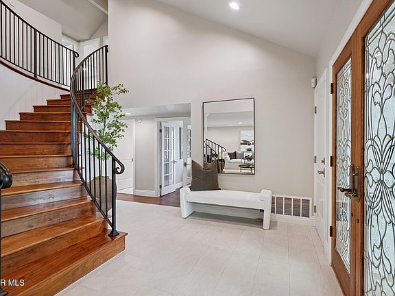Step inside through the grand double-door entry to soaring ceilings, a dramatic spiral