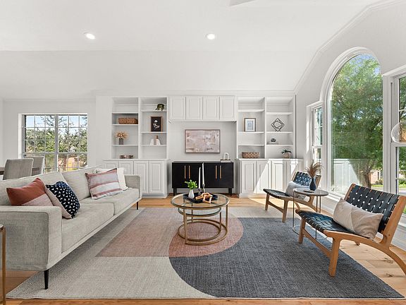 Brick fireplaceUpdated fixturesDedicated officeExpansive windowsHardwood floorsExpansive patioBuilt-in bookcases