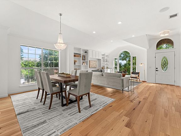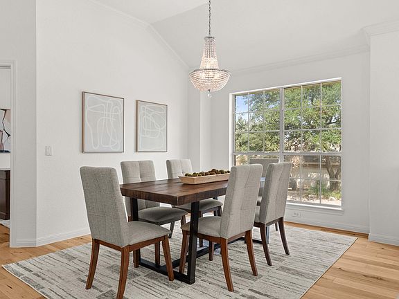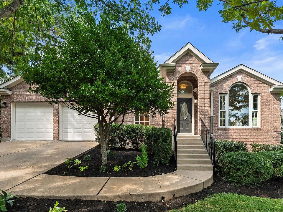 Nestled on a quiet cul-de-sac in Circle C Ranch, this rare 3,154 sq ft one-story home sits on a quarter acre corner lot, offering space, privacy, and thoughtful updates throughout. Hardwood floors extend across the home, complemented by fresh interior and exterior paint, updated fixtures, and beautiful landscaping. The layout features 4 bedrooms, 3 full bathrooms, a private office, formal dining, a second living area, and a spacious family room, making it both functional and inviting. At the front of the home, the dining and living areas showcase vaulted ceilings, built-in bookcases, and a large arched window that adds charm and natural light. A dedicated office is tucked nearby for quiet work-from-home needs. The updated kitchen is the heart of the home, with a vaulted skylight, quartz countertops, subway tile backsplash, tall cabinets, stainless appliances, double ovens, and a breakfast bar with storage. It opens to a casual dining nook and a family room with a brick fireplace, built-ins, and expansive windows. The primary suite is privately located at the rear, offering vaulted ceilings, a bay window, a large walk-in closet, and a spa-like bath with dual vanities, quartz counters, soaking tub, and frameless shower. Three secondary bedrooms are set on the opposite side, with two near a shared bath and a third paired with another full bath for flexible living. A dedicated laundry with sink and folding counter is conveniently located off the garage. Outdoors, mature trees provide shade and privacy, while an expansive patio and irrigation system make it easy to enjoy year-round. The house is extensively wired for data networking and has a built-in sound system. This move-in ready home has been pre-inspected for even the most discerning buyers.
