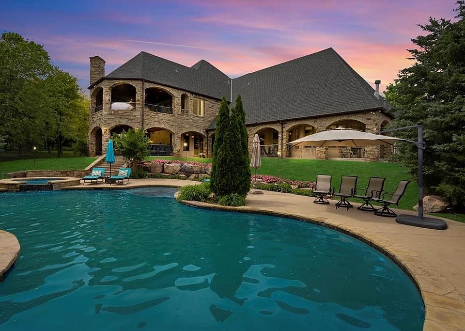 Located in the private, gated community of Edgewater to Edmond, this Edmond-area estate offers a refined blend of country serenity and luxury living, all within minutes of city conveniences. Thoughtfully designed for both comfort and entertainment, this custom-built home sits on a meticulously landscaped lot surrounded by mature trees and open green space, providing a true sense of privacy and connection to nature. Inside, you'll find a spacious, light-filled layout featuring soaring ceilings, wood beams, and designer finishes throughout. The chefs kitchen is equipped with top-tier stainless steel appliances, a Hoshizaki commercial ice maker, oversized island, walk-in pantry, and custom cabinetry perfect for everyday living or entertaining on a larger scale. The main living areas open to multiple covered outdoor living spaces, including an outdoor fireplace, lounge area, and a custom resort-style heated pool with rock waterfall a true centerpiece for gatherings and relaxation. Professionally designed landscaping, ambient lighting, and a full irrigation system elevate the exterior experience. Inside, the home includes a large primary suite with spa-like bathroom, a home theater with 120 screen and built-in surround sound, game room, bonus room, and an executive office suite with custom built-ins. A framed-in shaft allows for the future installation of a residential elevator, making the home ideal for long-term, multi-generational use. Located just minutes from Lake Arcadia, you'll have easy access to boating, fishing, paddleboarding, hiking and biking trails, picnic areas, and family parks. The home is also ideally positioned near major highways, offering quick connections to Edmond schools, dining, shopping, and downtown Oklahoma City. This rare offering combines custom construction, luxury amenities, and a highly desirable locationmaking it one of the most complete and versatile properties available in Edmonds gated luxury market.