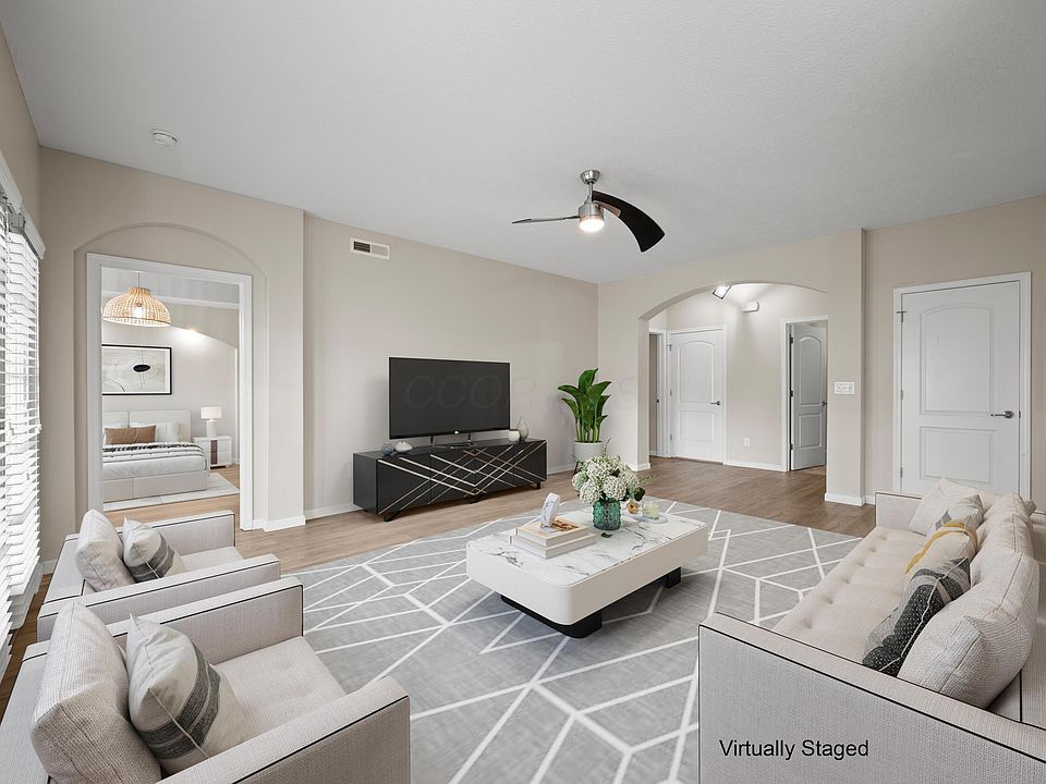 Experience wonderful, convenient first-floor living in highly-rated Olentangy Schools! This contemporary 2 bed/2 full bath condo is ideally located between Olentangy High School, Shanahan Middle, and Heritage Elementary. All are easily within walking distance! Inside, you will find new (2023) laminate flooring in great room, and fresh paint throughout (2025). First floor laundry with washer and dryer to stay, and relaxing rear patio porch. Stainless appliances, updated lighting fixtures, and ceiling fan. Office/Den near front entrance can work as a possible 3rd bedroom! Very reasonable monthly condo fee of $225 covers exterior maintenance, snow removal, lawn care, pool, clubhouse workout area, and trash! Close proximity to US-23, Shale Hollow Park, Kroger, and many other shopping/eating destinations. Be seeing you!
