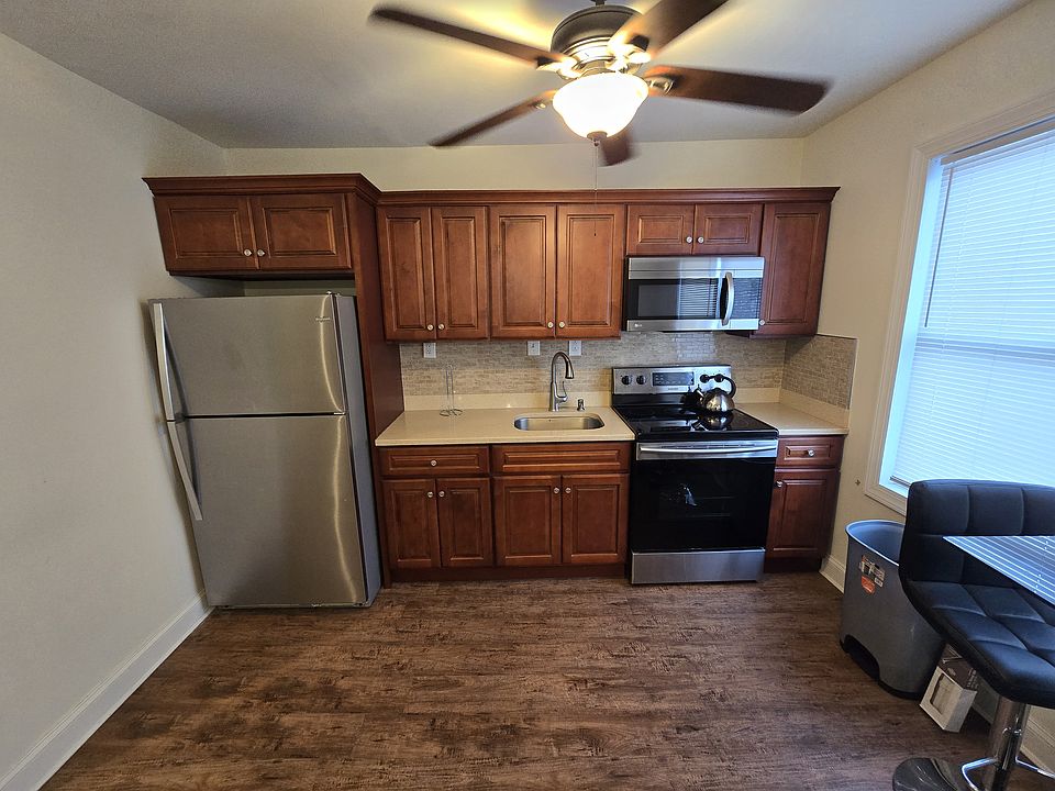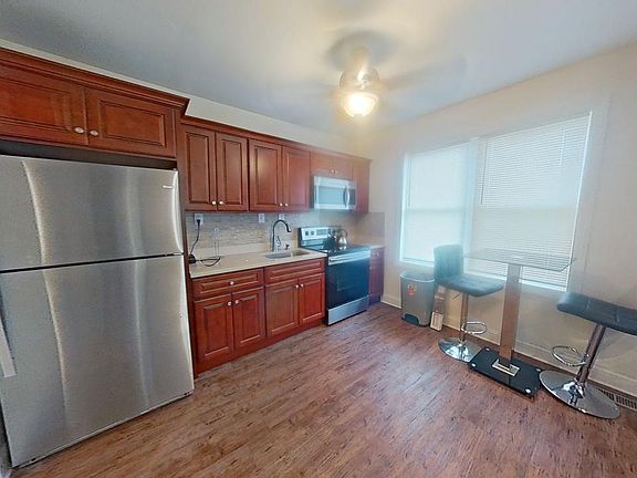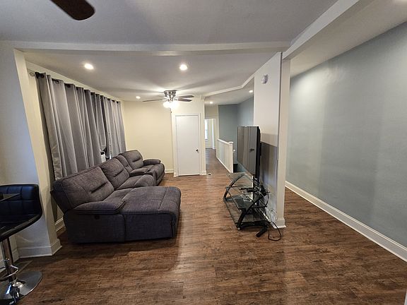 This large apartment, located at 5901 Springfield Ave in Philadelphia, offers a well-designed living space with modern amenities. The unit features two bedrooms, including a primary bedroom of 200 sq. ft., and one bathroom. The open-concept layout maximizes the available space, creating a seamless flow between the living areas. The kitchen boasts wooden cabinets and stainless steel appliances, opening directly into the living room for easy entertaining. The living area is furnished with a comfortable sectional sofa and a large flat-screen TV, perfect for relaxation. Hardwood floors run throughout the apartment, adding warmth and durability to the space. The bathroom is outfitted with clean white tiles and fixtures, including a full-size bathtub with a shower. Ceiling fans and recessed lighting contribute to the overall modern aesthetic. Natural light floods the rooms through multiple windows, some equipped with horizontal blinds and blackout shades for privacy. The neutral color palette of whites and light grays creates a bright, airy atmosphere throughout. This apartment offers a comfortable and efficient living space in an urban setting, ideal for those seeking a balance of style and functionality. No smoking allowed in the building. Renter responsible for all utilities. Lease term 12 months. Tenant screening includes, income verification, rental history, credit history, criminal history and background checks.