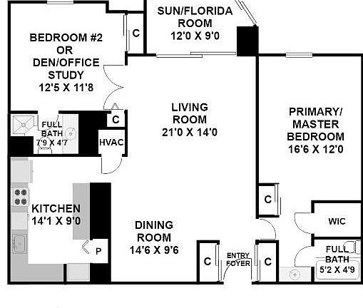- Room types: Living Room, Dining Room, Primary Bedroom, Bedroom 2, Kitchen, Sun/Florida Room, Bathroom 2, Primary Bathroom