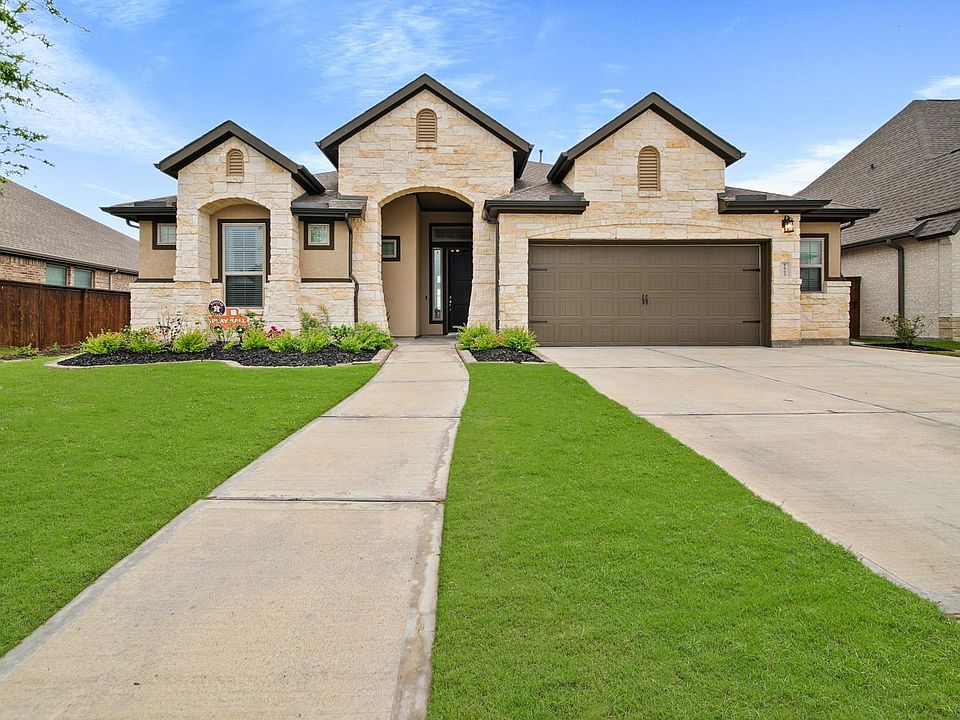 LAKEFRONT HOME IN MERIDIANA MASTER PLANNED COMMUNITY! This exquisite Chesmar home is a single-story property combining limestone and brick, offering 4 bedrooms, 2.5 bathrooms, plus a study/office. It boasts an open floor plan with abundant natural lighting and lake views. The office/study features elegant French doors. The kitchen is equipped with a large island to cater to your entertaining needs, a gourmet kitchen upgrade package with granite countertops consistent throughout the residence. The kitchen boasts a backsplash that extends to the ceiling, cabinetry accented with under-cabinet lighting, and high-end appliances. The primary suite includes a dual-person shower with seating and a luxurious soaker tub. The property's curb appeal is heightened by an expanded garage and driveway, an irrigation system, and a covered patio with a gas connection. Enjoy the serene lake views from the backyard, framed by a wrought iron fence. This dream home comes with $39,950.00 in upgrades.