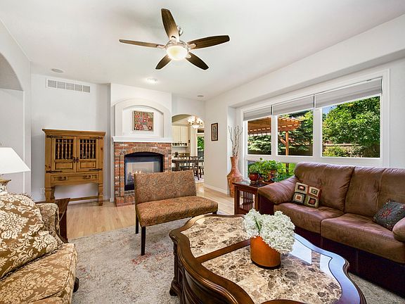 The heart of the home is a generous eat-in kitchen with hardwood floors, granite countertops, and sleek slate appliances, all opening to a cozy double-sided fireplace shared with the living room. Step outside to a beautifully landscaped backyard with a large patio and pergola perfect for mountain views and unforgettable Colorado sunsets.