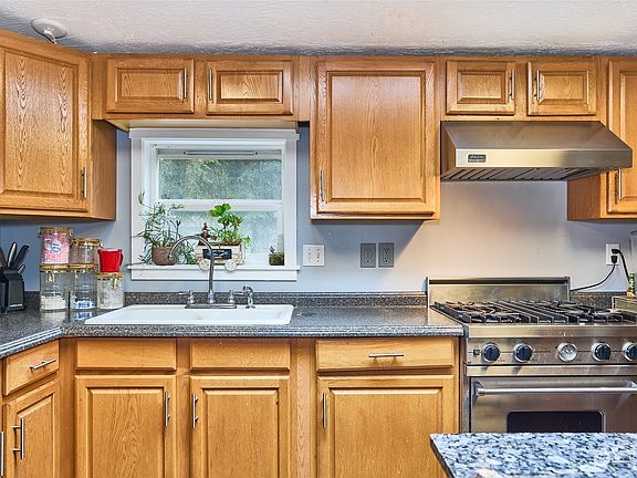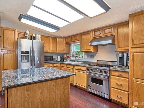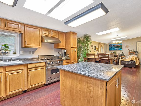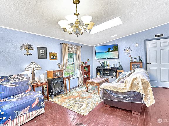 Excellent manufactured home on a large lot with mature landscaping. 3 bedroom, 2 bath home. Covered back deck is perfect for outdoor living and entertaining. Extra-large triple pane windows. Bamboo floors. Kitchen has Viking gas range, granite island, and stainless-steel appliances. Skylights make the kitchen and dining areas bright and cheery. Open concept with vaulted ceilings. Primary bedroom with walk in closet & bath featuring slate walk-in shower. Spacious family room with laminate floors. 40 x 20 detached shop/garage and designated workshop area with a free-standing wood stove. 2 additional storage sheds. Maintenance free vinyl siding. Tankless hot water heater. Newer roof in 2019. Plenty of parking. Heat pump. Fully fence pet area.