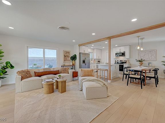 Exquisitely renovated by Modiano Design in historic Charleston Heights, this reimagined home on Apple Valley Lane blends timeless charm with modern upgrades. The single-story offers 3 bedrooms, 2 updated baths, and a flexible space ideal as a 4th bedroom, office, or studio. Highlights include new dual-pane windows/doors, sleek flooring, and a chef’s kitchen with island and custom cabinetry. Recessed lighting throughout, modern bathrooms with fresh tile and vanities, and a primary suite with custom walk-in closet to elevate the space. Additional custom cabinetry enhances storage in the hallway as well as the flex/den. An open-concept living area centers around a wood-burning fireplace and bright new sliding door which leads to new patio for outdoor dining. Enjoy solar panels (24'), an electric-only setup, energy-efficient HVAC (22'), and a 2-car garage. No HOA! Minutes from the 95 Freeway, top Las Vegas attractions, and steps to the local Elementary school. A truly one-of-a-kind home!