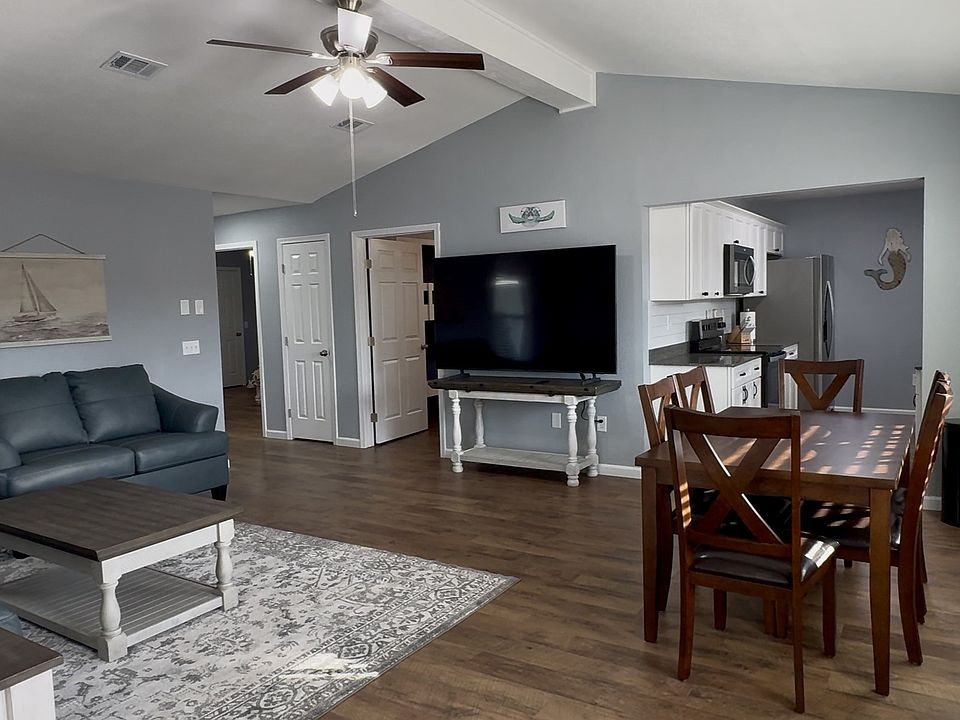 Welcome to our completely renovated fully furnished 2 bedroom: One spacious bedroom with Queen and bath. One Spacious bedroom with Queen and bunk beds. One full bathroom, living room has Queen pull out sofa, 75" T.V., Full kitchen and dining room - Sleeps 8 Comfortably. Washer and Dryer access directly from unit. Private deck with picnic table and grille overlooking the Bay and dock. Parking on property and in front of rental.
