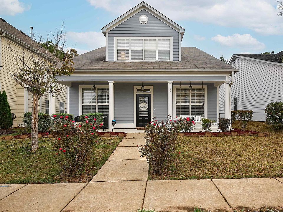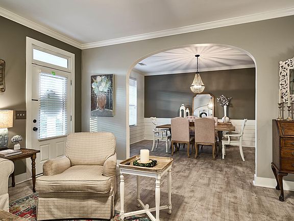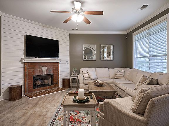 Wonderful floorplan features 3 bedrooms & 3 full baths. Welcoming front porch & entry. Living room offers a brick fireplace & hearth, gas logs, crown molding & lighted ceiling fan. Dining room with updated chandelier, crown molding, chair rail & shiplap trim. Beautiful kitchen with white cabinets, quartz countertops, tile backsplash, 12” tile flooring, pantry, stainless dishwasher, microwave, electric stove & nice eating area. Covered patio & backyard just a few feet away. Relax in the private owner's suite with sitting area, neutral carpet & seven windows provide wonderful natural light. The bathroom features a dual-sink vanity, jetted garden tub, tile surround, shower with a glass enclosure, large walk-in closet and linen closet. Guest bedrooms feature neutral carpet, lighted ceiling fans and one has its own private bathroom. Newer flooring in most areas. Easy-access walk-up storage. Fenced backyard, Hardie siding, neighborhood pool & playground. Convenient to shopping & interstate.