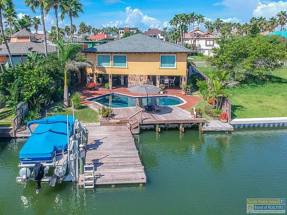 Channel front 4 bedroom 3 bath home with 3,140 sq. ft. located on a quiet cul-de-sac with no through traffic. This property features a heated saltwater pool, expansive open air living area with a built-in outdoor kitchen complete with gas grill, sink, bar, mini fridge, microwave, air fryer/toaster oven and outdoor TV. Enjoy the convenience of laundry on both levels, a chef's kitchen with gas stove and large walk-in pantry, reverse osmosis system, plus spacious living areas upstairs and downstairs. The master suite offers its own private sitting area. Outdoor amenities include a new dock with a 10,000 lb boat lift, new seawall, outdoor shower, rod and reel racks, and plenty of space for entertaining. The downstairs includes a small apartment with its own laundry, and the garage provides an additional fridge/freezer along with a workroom for tools. This home is designed for boating, fishing, entertaining, and enjoying the South Padre Island lifestyle.