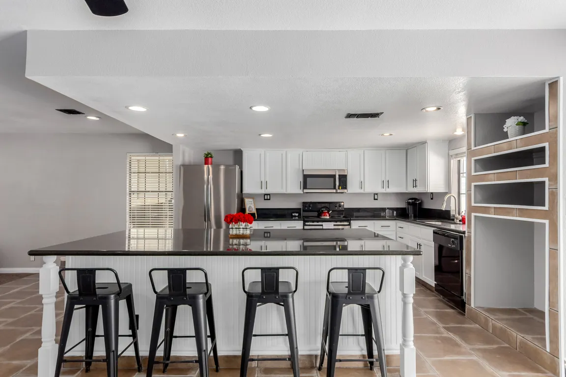 - Description: Breakfast Bar/Counter,Granite Countertops,Island,Stainless Steel Appliances,Tile Flooring