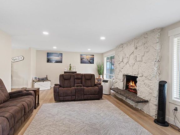 Impressive rock fireplaceUpdated kitchenCraftsman style trimLed lightingLarge fenced backyardFull sprinkler systemRock accents