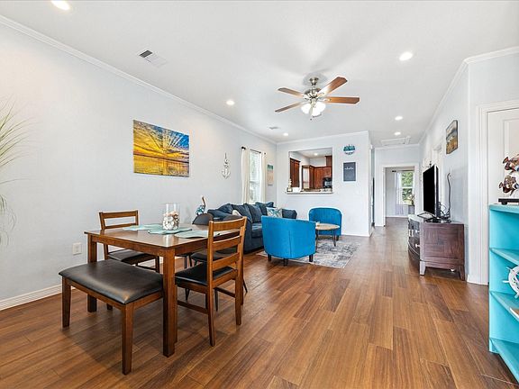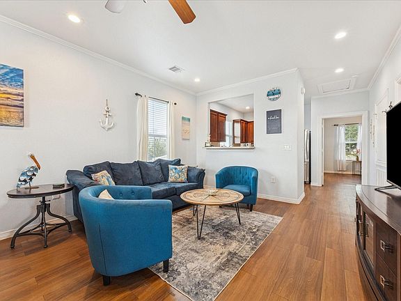 This beautiful home is located just a short five-minute walk to the beach. As you walk up the stairs, you'll discover an open layout featuring a well-equipped kitchen that seamlessly opens up to the family/dining area. The home offers a practical split floorplan w/ 2 bedrooms and 2 full bathrooms upstairs, providing privacy & comfort. An additional bedroom & half bathroom are located downstairs, complete w/ a minisplit AC/heat system for year-round comfort. Enjoy a huge covered patio area downstairs, perfect for entertaining or hosting large family gatherings. The fenced-in backyard provides a secure & private space for children and pets to play. Currently utilized as an Airbnb, property will be sold with all furnishings included, making it ready for immediate move-in or continued rental use. Home AC system was replaced in 2024. The location is unbeatable, being close to local restaurants and activities. This is a must-see property! Schedule your appointment to see this today!