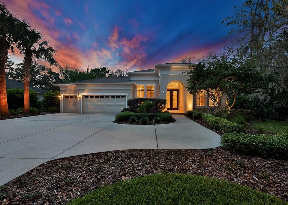 Absolutely exquisite executive home in coveted Fishhawk Ranch that you don’t want to miss! This Homes by West Bay customized Key Largo one story floorplan will take your breath away. Situated on a lush fenced corner lot surrounded by conservation behind and on the side, the home features extensive outdoor lighting and landscaping that makes you feel like you are on vacation every day of the year. Enter the property through a motorized front gate to a large driveway with extra parking pad. Step onto the covered front porch and head through the glass-paneled double entry front door with overhead transom window into the roomy foyer. Once inside, you are greeted by 12 foot ceilings and warm, inviting hand-scraped engineered hardwood floors that expand through the main areas of the home creating a seamless flow. The foyer is flanked by the formal dining room and cozy den complete with crown molding and extra recessed can lighting. The large, open concept gathering room and dining nook centralizes your entertaining space complete with in-ceiling surround sound speakers, recessed can lighting with dimmer switch, crown molding and French doors leading to the patio. The gourmet kitchen is the heart of the home and features stainless steel appliances to include a 4 door refrigerator (6 mos old), gourmet range hood, gas cooktop, and a wall oven and microwave. The huge center prep island with room for several barstools adds to the ample cabinetry and storage space. The large walk-in pantry houses all your dry goods and more. An adjacent laundry room also features a wet sink and extra cabinetry. In the 3 car garage you will find a water-softener, 220V outlet, additional insulation above and installed mini-split AC unit for a cool weekend workspace. The master bedroom was customized at build out with additional recessed can lighting on dimmer switch, stepped tray ceiling, and 8 foot double door entry. You will marvel at the lighted shoe storage shelving and customized closet! A convenient exit to the patio and rear yard provides the perfect morning coffee spot. The en-suite bathroom is adorned with neutral finishes, granite tops, a convenient vanity space, upgraded mirrors, a large walk in duel-head shower and a relaxing soaking tub. Two additional carpeted guest bedrooms are featured on the opposite side of the home along with a hall bath. The 4th bedroom or bonus room on the back of the home was used as a theater room and the screen and wall storage cabinet will convey. Access the exterior through a patio door to enjoy the outdoors. The amazing backyard oasis includes a gorgeous in-ground saltwater plunge pool/heated spa with fountain. The well-thought out landscaping creates the perfect destination for a private tropical retreat. Features include pavered walk ways, tiered retaining walls, multiple planting beds, architectural lighting, hard-scaped side yards, gas connection for future outdoor kitchen on lanai, and a large relaxing lighted and furnished pergola for entertaining. HVAC 2022, Exterior Paint 2023.