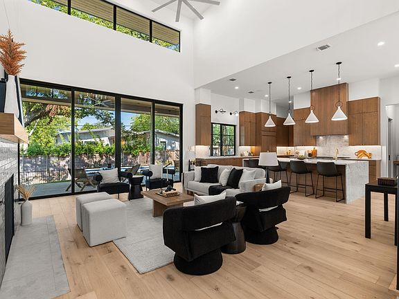 This brand-new construction home is a masterpiece of modern design, offering 5 bedrooms and 5 full bathrooms across a thoughtfully designed layout. Step through the custom 10’ white oak front door into a dramatic main living space, where soaring 20+ foot ceilings and oversized Ram steel sliders set the stage for seamless indoor-outdoor living. Beyond the glass, a sparkling pool, expansive covered patio, and custom outdoor gas fire pit create the ultimate backyard retreat for entertaining or unwinding in style. The chef’s kitchen is a statement of elegance and performance, featuring striking marble countertops, a Wolf/Sub-Zero custom panel appliance package, and a spacious butler’s pantry complete with a second dishwasher. A custom dry bar built into the dining area adds sophistication to every gathering. The home’s five bedrooms are designed with flexibility in mind, including a convenient secondary bedroom on the main floor. Also on the main floor, the spa-like primary suite offers a true retreat with a soaking tub and calming finishes, including access to the covered patio. Throughout the home, thoughtful design abounds—from rich tones of green and blue woven into the interiors, to hidden storage under the stairs, to a custom entry drop zone that marries beauty with function. A three-car garage with an added storage room ensures space for every need, while details like the oversized front entry and curated finishes highlight the craftsmanship at every turn. This home blends bold design with livability—an unforgettable new build in one of Austin’s most desirable neighborhoods.