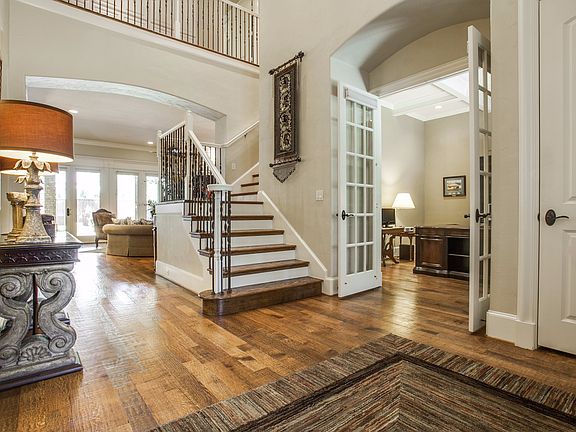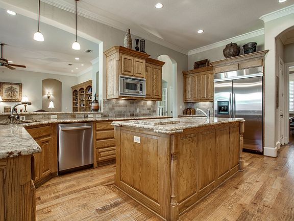 Fabulous .53-acre tree lot! Two-story entry, hand scraped wood floors, and kitchen open to family room with stone fireplace. Walls of windows across the back of the house views enormous backyard with covered patio and grill station. Large island kitchen with 6-burner gas cook top and griddle, double ovens, sink in island, granite counters and all SS appliances. Study off entry with double glass French doors and center-hall plan to staircases. Wonderful mudroom with computer workstation under the back stairs with a huge closet. Built-ins in mudroom hallway for cubbies, half-bath off kitchen, huge utility room with uppers and lowers and an additional sink. Side door to backyard and patio, another side door to motor court and a third side door to garage. Three bedrooms UP with media room and game room. Game room has large window seat with storage underneath, one wall of built-in storage with television. Very large secondary bedrooms with walk-in closets. Tons of storage throughout the entire house. 4-zones HVAC. Split fifth bedroom downstairs off kitchen with full bath. Master with sitting room that views backyard. Master bath with marble floor, frameless glass shower with two showerheads, two separate walk-in closets. See Amenity Page online.