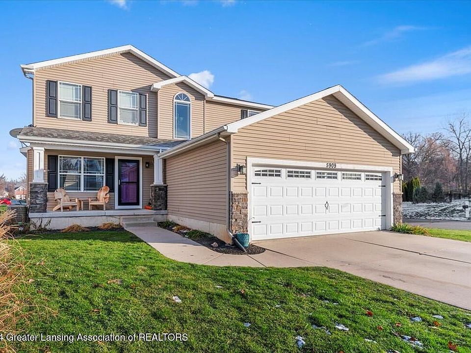 Welcome to 5909 Chartres Way; a lovely 4 bedroom, 3 and a half bath home in the Haslett School District. This expansive home has all the special touches that you are hoping for, high ceilings, open floor plan, gas fireplace with built-ins, luxurious family room and bar area (there is even a wine closet), and a heated garage. Enjoy Haslett schools with low Bath Township taxes. You are welcomed into the main level with a covered front porch, ready for you to sit back and watch the world go by. Once you step inside the open floor plan embraces all of your daily activities, including a beautiful kitchen island to gather around for cookie making. Live out your meal prep dreams on the gas stove with a direct vent hood and double ovens. Winter nights call for the cozy fireplace. The laundry room and separate half bath are also on this level. Upstairs 2 bedrooms share the hall bath and the primary bedroom includes a walk-in closet and its own full bath with dual sinks. Check out the 12 foot vaulted ceiling in the oversized primary bedroom! The lower level is finished with all your entertainment needs in mind, family room, bar, pool table, full bath, it's all here. Take note of the custom artist designed accent wall and bar top! The fourth bedroom is on this level and includes a huge walk in closet. Don't miss the insulated and heated garage this could be your gym, hobby area or just a great place to keep your cars. The separate gas garage heater has its own thermostat. HVAC sytem is dual zoned with an independent 2nd floor system. Water heater is 50 gallons. This property is eligible for Rural Development financing. Reserved items are all curtains and rods, play equipment, and drum set. Blinds will stay with the home.