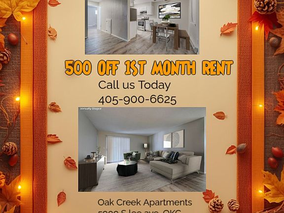 Oak Creek Apartments are located in a secluded neighborhood in Oklahoma City, OK. Our apartments our newly renovated with Stainless Steel Appliances, LED Lighting, Luxury Plank Flooring, AC, Ceiling Fans and modern paint colors. Our residents enjoy onsite laundry, community pool, dog park, and ample parking for residents and their guests. Our residents enjoy access to a wide array of local entertainment restaurants and public transportation as well as onsite amenities.