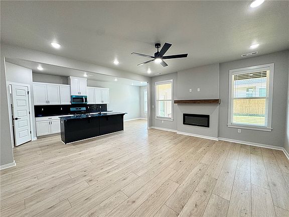 Fence, blinds and gutters included! Discover your dream home in the sought-after Osage Hills neighborhood. Clinton plan with garage on the right & North facing! 9 ft ceilings, linear electric fireplace in the living room, LVP flooring throughout the main living areas and primary bedroom, quartz countertops and more. Chef's kitchen boasting frigidaire stainless steel appliances, gas range, pantry, quartz countertops, bar pull handles, large island and gorgeous backsplash. Luxurious primary bedroom features abundant natural light, while the spa-like primary bathroom offers a walk-in shower, double sinks and spacious walk-in closets. Two secondary bedrooms on the main level, a 4th bedroom upstairs that would be a perfect bonus room & a separate laundry room. Nestled on a generous lot with covered patio that overlooks the serene sodded, fully fenced backyard. Sturdy concrete siding & brick! Model home located at 6008 SW Coywolf St- Lot 122.
