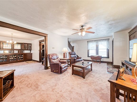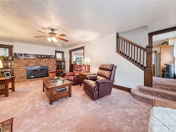 This charming brick home built in 1900 is a true gem with its timeless appeal & modern amenities. Stepping inside you're greeting by a spacious living room, featuring a log burning stove, perfect for cozy evenings, built in cabinets add character & provide convenient storage. The dining room is equally impressive w/ample space for large gatherings & showcasing more built-in cabinets & stunning stained glass windows. The kitchen is equipped with a gas stove, refrigerator & dishwasher. Outside the current owners have thoughtfully added a huge concrete driveway that easily accommodates at least 5 cars ensuring plenty of parking for guests. The covered front porch is large as well. The deck on the back provides a lovely spot for outdoor dining or relaxation. The basement was finished approx 4 yrs ago & offers additional living space & includes a full bath. There's also TONS of storage. This home is not just a house - it's a place where memories are made! Start making memories today