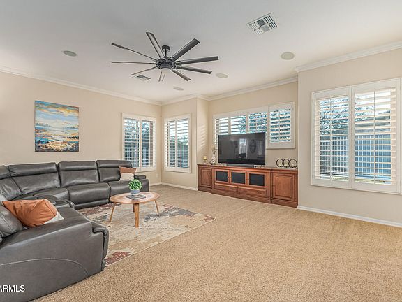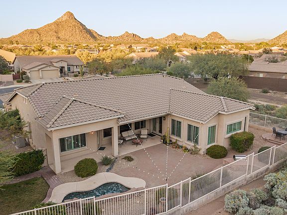 GATED enclave beside Stetson Valley, this Shea-built single-level home delivers the luxury buyers crave, BACKYARD MOUNTAIN VIEWS, privacy, & an indoor-outdoor lifestyle that feels like a retreat. Set on a rare ¼-acre cul-de-sac lot with no neighbor on one side, this home lives bright & open with large Low-E windows, plantation shutters, a split floor plan, & direct backyard access from the living room & primary suite. Enjoy a heated ''spool'' w/water features, lush green lawn, and sunlit patio looking out to the mountain. A true 3-car garage, flexible 4-bed layout (4th currently office), & an accessible peaceful walking trail just outside complete the picture! This home offers the rare combination of privacy, views, and space, ideal for full-time living, working from home, or a lock-and-leave lifestyle. The generous .26-acre lot feels wide open, allowing sunlight and scenery to pour through the oversized windows. The backyard is designed for year-round enjoyment with a heated spool, soothing water features, natural-gas fire pit & BBQ, terraced fountain, and green grass for pets and play. Solar screens help keep the home cool, while the shady covered patio creates a relaxing escape from morning to evening.