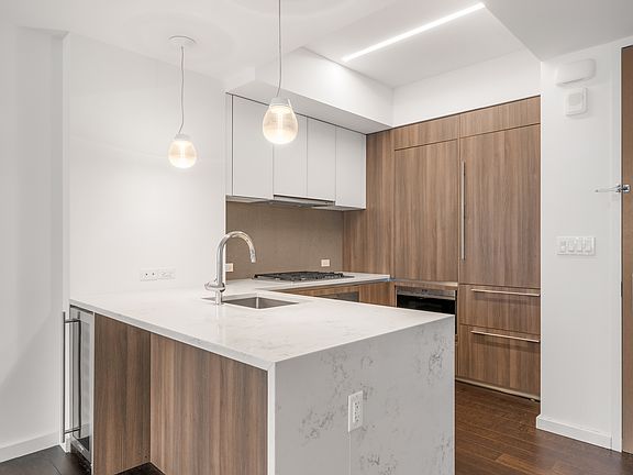 You are greeted at the entrance by an open-concept living room, dining area, and kitchen with plenty of light with its open eastern exposure. Dark hardwood floors complement oversized double-paned windows and features include Lutron motorized shades and central A/C. The high-end kitchen is adorned with a waterfall, eat-in breakfast bar, sleek granite countertops, vented hood, garbage disposal, and a suite of top of the line appliances including a Subzero refrigerator/freezer, Wolf gas range/oven, Bosch dishwasher, wine refrigerator and drawer microwave. The bedroom is spacious and bright with a walk-in closet and easy access to an immaculate full bathroom with radiant heated terrazzo floors imported from Italy, marble tile walls, a Miton Cucine vanity and medicine cabinet, an oversized sink basin with a wall-mounted Atrio Grohe faucet, and a walk-in thermostatic shower with rainfall and handheld showerheads from Grohe. In-unit Bosch W/D for all your laundry needs.