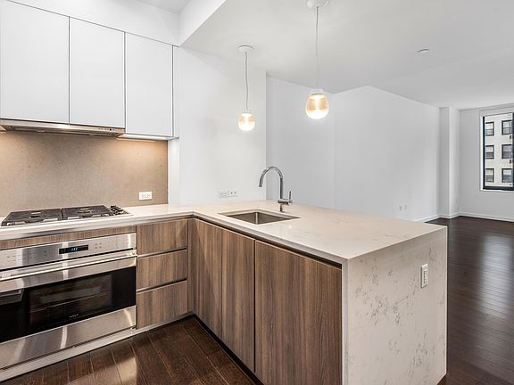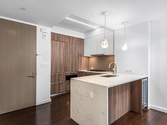 The spacious living/dining room boasts oversized west-facing double paned windows which flood this home with natural light. A stylish open U shape chef's kitchen is equipped with ample New York Carrera quartz countertops with smoky gray quartz backsplashes, a full-sized Sub-Zero refrigerator with a two-drawer freezer and filtered water dispenser, a fully vented four-burner Wolf range and oven, and a large Elkay stainless steel sink with an Insinkerator garbage disposal.
