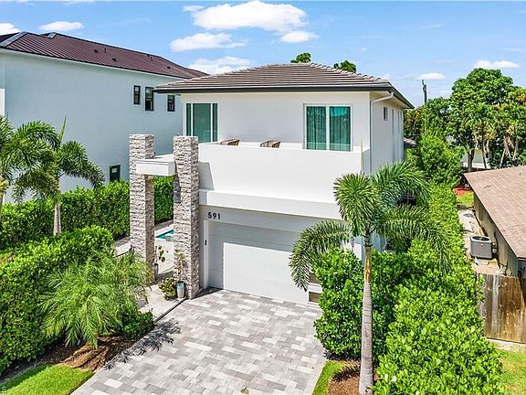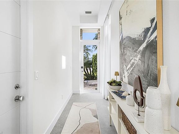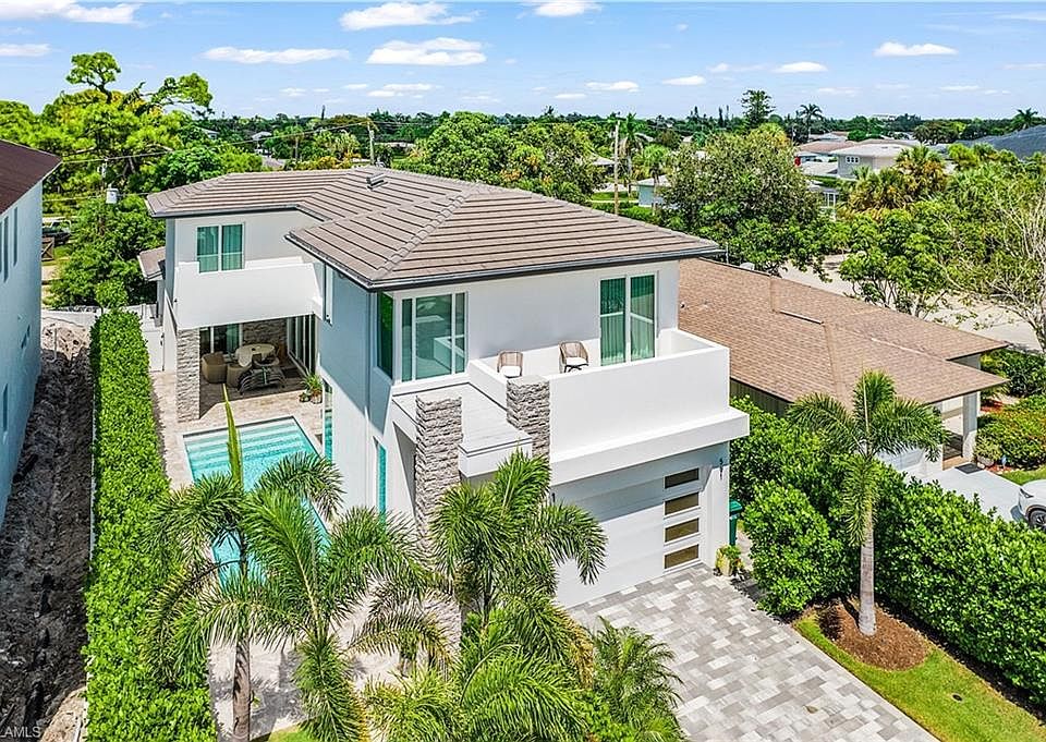 This Modern Beauty is just steps from the beach, located on the desirable 500 block of 93rd Ave (X500 flood zone) and offered turnkey furnished with over $300K of upscale furnishings, custom window treatments and tasteful decor included in the price! Quality built with masonry construction, precast concrete floor and concrete topping slab on 2nd floor that is rare to find in Naples Park (over $100K upgrade). Primary suite is conveniently located on the 1st floor and offers sliders that lead to lanai and pool, large walk-in closet, bathroom with dual sinks, walk-in rain shower and custom tile work. The 2nd floor boasts an additional primary suite with king bed, dual sinks, water closet and private balcony overlooking the pool and views to the west. Two additional bedrooms with queen size beds and ensuite baths, full laundry room and spacious loft with private balcony to enjoy beautiful SW Florida sunsets. Gorgeous kitchen with island, ample cabinets, pantry and stainless steel appliances. Heated pool with water feature, outdoor enclosed shower and ample deck space. The home also features impact glass on all windows and doors, two high efficiency AC system, additional washer and dryer in garage for all your beach towels, and so much more. All of this and less than a mile walk to the beautiful beaches of the Gulf, and a short walk to the shops and restaurants of Mercato.