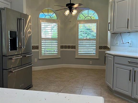 Welcome to this stunning, unfurnished 3-bedroom, 2-bathroom Designer Gardenia floor plan in the heart of the Village of Amelia. This home features a 2-car garage and an indoor laundry room with a washer and dryer. You'll love the convenience of being just a short walk to the Amelia Neighborhood Recreation Center, where you can enjoy the adult pool and nearby mailboxes. Inside, there's no carpet to worry about only beautiful laminate flooring in the living, dining, and bedrooms, while the rest of the home features stylish tile. The kitchen is a chef's dream, with white cabinets, quartz countertops, stainless steel appliances, a breakfast bar, and an eat-in area perfect for casual meals. The split floor plan ensures privacy, with the primary bedroom offering direct access to the lanai, two walk-in closets, and an en-suite bathroom that boasts double granite vanities, a tiled walk-in shower, a private water closet, and a linen closet. The enclosed lanai adds extra living space, complete with a tiled floor, full-length glass sliders, and a mini-split system for heating and cooling. The second bathroom includes a tub/shower combo, ideal for guests. Outside, you'll find an oversized lot providing plenty of space between neighbors, creating a peaceful outdoor retreat with a pergola-covered back patio and lush tropical landscaping. This centrally located gem is just minutes away from the vibrant town squares. Lake Sumter Landing is a short 5-minute drive (2.4 miles), Spanish Springs Town Square is 12 minutes away (5.1 miles), and Brownwood Paddock Square is just 13 minutes (6.6 miles). Each offers nightly entertainment and plenty of shopping and dining options. The Villages is a 55-plus community, so no full-time occupants under the age of 19 are allowed. A non-refundable application fee applies. The home is non-smoking, and pets are not permitted. Tenant responsibilities include paying the electric bill (set up in the tenant's name) and the water bill, which is paid directly to the owner. A security deposit equal to two months' rent is required prior to move-in. The Villages Guest ID is available once your driver's license reflects the home address.