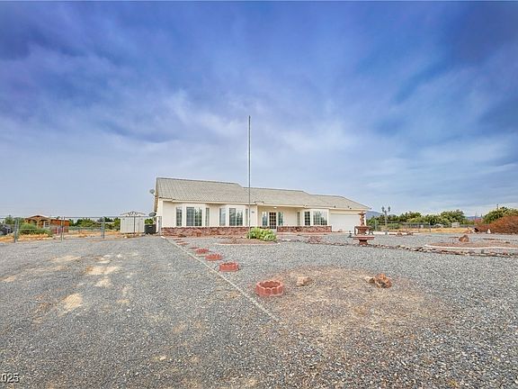 Welcome to this beautiful, single-story, custom home! Located in a desirable Pahrump location, this home offers nearly 2700 sq ft of living space & sits on over an acre of land in a quiet cul-de-sac. Inside, the 4 spacious bedrooms include a primary suite with a large walk-in closet, soaking tub, & separate shower. The 3 additional bedrooms, located on the opposite side of the home, include 2 with charming bay windows & a large oversized room with walk-in closet that would also act as a great home office. The living room is open with vaulted ceilings & a cozy fireplace, while the kitchen features a breakfast bar, nook, & formal dining area. Additionally, there are ceiling fans in every room, a very large linen/storage closet, separate laundry room, and huge walk-in pantry. Beat the heat outside with a sparkling pool & covered patio, keep those electric bills low with the installed solar panels, and enjoy the quality of your water provided by the water softener. This home is a MUST SEE!