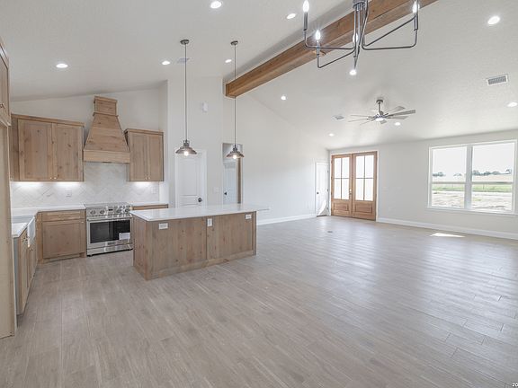 This beautifully crafted custom home on acreage sits on 1.5 acres and offers nearly 2,000 square feet of living space with 3 bedrooms and 2full bathrooms. This Texas custom-built home features custom shaker-style cabinets, soft-close drawers, quartz countertops, and wood-looktile flooring throughout, delivering both style and durability. The open-concept living area boasts soaring 15+ foot ceilings with a cathedralceiling design, creating a spacious and inviting atmosphere ideal for entertaining and everyday living. The split floor plan provides privacy,with the primary suite on one side of the home and secondary bedrooms on the opposite side. Built for long-term performance and comfort,this energy-efficient home includes high-performance windows, Hardie siding, 30-year architectural shingles, and a Carrier HVAC system,ensuring efficiency and comfort year-round. The home is also well insulated and features custom-tiled showers and quality finishesthroughout. With limited neighboring homes, expansive surrounding acreage, and over 300-acre neighboring properties, this home offerspeaceful country living, privacy, and scenic sunrise views, while still providing convenient access to nearby amenities. A perfect opportunityfor buyers seeking a modern farmhouse, new construction on land, or a luxury country home with space, privacy, and efficiency.