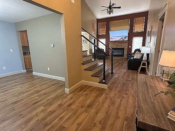Step inside this stunning 5-bedroom, 4-bath home. Open floor plan with 25ft vaulted ceilings that create a sense of openness. This home features brand new laminate flooring throughout the main floor. A kitchen that has quality cabinetry with tons of counter space, seamlessly flows through an open living area into the primary bedroom, and a big private bathroom. Inside you will find a Jacuzzi tub, marble floor, and a walk-in closet. As you exit the primary, you see a custom-built staircase leading to the second floor. Up here you will find three bedrooms with a full-sized bathroom. The fifth bedroom is in the finished basement. This bedroom has brand new laminate flooring, a gas fireplace, and a walk-in closet. Leading out to an additional open living space that offers a second complete kitchen setup, a walk out patio, utility room, and storage room.