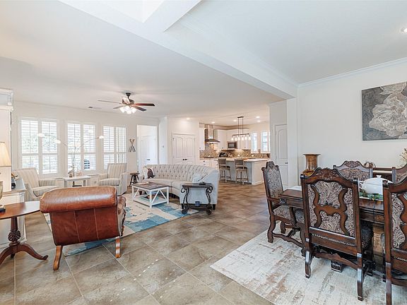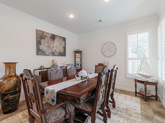 Gorgeous 2-bedroom, 2-bath home nestled in the highly sought-after 55+ Active Adult Community of Cross Creek Ranch. The beautifully landscaped front yard sets a welcoming tone. Step inside to a formal dining room accented with crown molding and recessed lighting. Tile flooring and plantation shutters flow throughout the home. The spacious family room boasts a wall of windows overlooking the serene backyard and opens seamlessly to the island kitchen featuring a breakfast bar, pendant lighting, stainless steel appliances, gas cooking, double ovens, under-cabinet lighting, and a convenient pantry. The lovely primary suite offers dual vanities, a walk-in shower, and a generous walk-in closet. Additional highlights include an owned water softener and pull-down attic stairs providing easy access to extra storage space. Enjoy relaxing or entertaining on the large covered patio surrounded by lush landscaping.