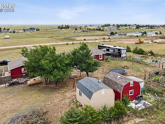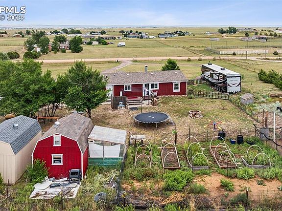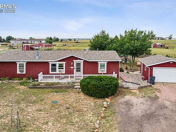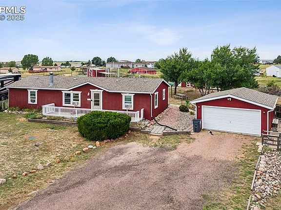 Ready for a move to the country? This home has everything you need to get started with rural living. The property is zoned for horses. This lovely home features LVT flooring, vaulted ceilings, and lots of upgrades. The kitchen has a huge pantry and a large island with storage on both sides. The master bath has been completely remodeled and features a huge shower with beautiful tile. Each bedroom has a walk-in closet. Fans are throughout the home. The exterior has stucco that was completed in 2019, a nice front porch to enjoy the views, a large rear patio with a pergola, cement walkways and a large cement pad next to the garage for entertaining. Two 16'x20' sheds with lofts and power add lots of storage and the potential for a workshop. Both have power run to them. A fenced chicken coop area includes a 8'x14' coop and large area for the chickens to roam. A detached, two car garage is ready for your vehicles and a 8'x12' metal shed is right next to the garage. Right next to the house is a RV pad complete with 50 amp service, hookup for septic and a hookup for water. The trampoline and swing set stay. Very close to shopping and food in Falcon and not far from the Powers corridor, this area is perfect for country living while still being close to the city.
