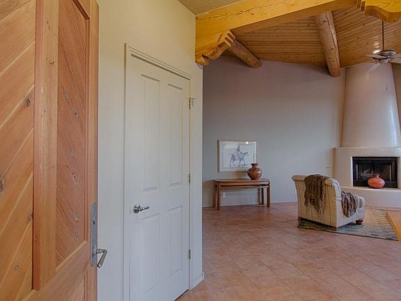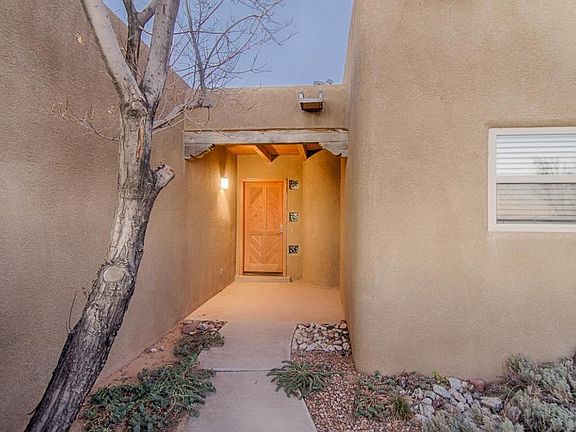 This beautiful custom Pueblo style home is a choice find. Situated on a .5 acre lot, this distinctive home captures your heart from the minute you enter the foyer and walk into the great room where you are bathed in natural sunlight. The almost full wall of windows facing east offers a stunning view of the Sandia Mountains and the lights of Albuquerque. This home's quality features include vigas, tongue and groove, corbels, kiva fireplace, a private courtyard, an office, a jetted tub in the master bedroom and much more. There is tile throughout the great room, dining room, kitchen and bathrooms. The large covered patio, accessible from either the great room or master bedroom, is ideal for entertaining. An awesome house for a great price! Don't miss this one! Owner will consider REC.