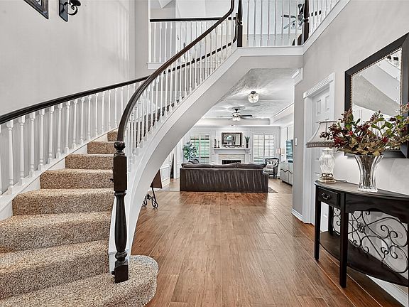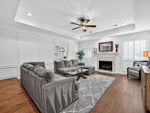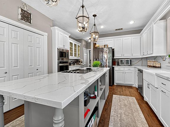Luxury living meets comfort in this stately brick home that blends timeless elegance with modern design. From the moment you arrive, the impressive curb appeal sets the tone. Inside, a grand foyer with hardwood floors and a sweeping staircase welcomes you. The main level offers a private office with French doors, a formal dining room, and a cozy living room with fireplace and wainscoting. The gourmet kitchen boasts a quartz island, white cabinetry, and farmhouse sink. The downstairs primary suite features a spa-like bath with soaking tub, walk-in shower, and spacious walk-in closet. Upstairs includes generous secondary bedrooms and well-appointed baths. Outdoor living shines with a covered patio for dining and entertaining, overlooking a sparkling pool and landscaped yard. A long driveway and detached garage provide ample parking.