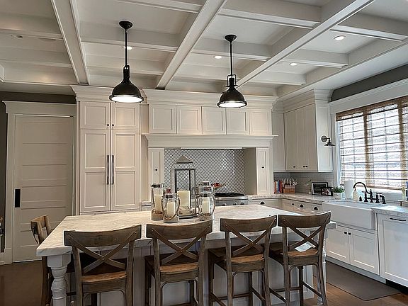 * Honed marble surfaces, white cabinetry and Thermador appliances highlight the kitchen.