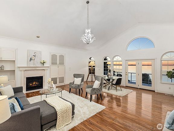 Gas fireplaceEndless water viewsManicured gardensMature apple treesPrivate beach accessSpa-inspired primary suiteWalls of glass